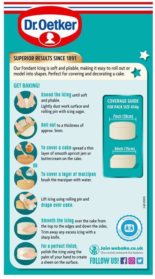Η έτοιμη ζαχαρόπαστα της Dr. Oetker είναι ιδανική για την κάλυψη Χριστουγεννιάτικων κέικ φρούτων ή για τούρτες γενεθλίων όλο το χρόνο – παρέχοντας ένα απαλό κάλυμμα που μπορεί στη συνέχεια να διακοσμηθεί με γλάσο ή στυλό γραφής. Αυτή η απαλή και εύκαμπτή ζαχαρόπαστα μπορεί να χρωματιστεί με Τζελ χρώματος τροφίμων για διαφορετικό σχεδιασμό. Ξεδιπλώστε για να τη χρησιμοποιήσετε ως κάλυψη σε κέικ ή χρησιμοποιήστε τη για την κατασκευή μοντέλων και σχεδίων για μια πιο προσωπική πινελιά.