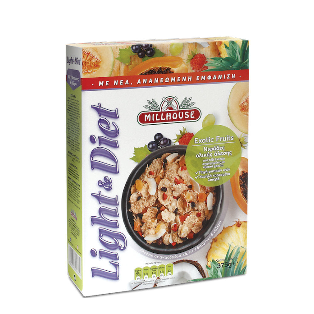Απολαυστικές νιφάδες από ρύζι και σίτο ολικής άλεσης, αναμεμιγμένες με εξωτικά φρούτα.
