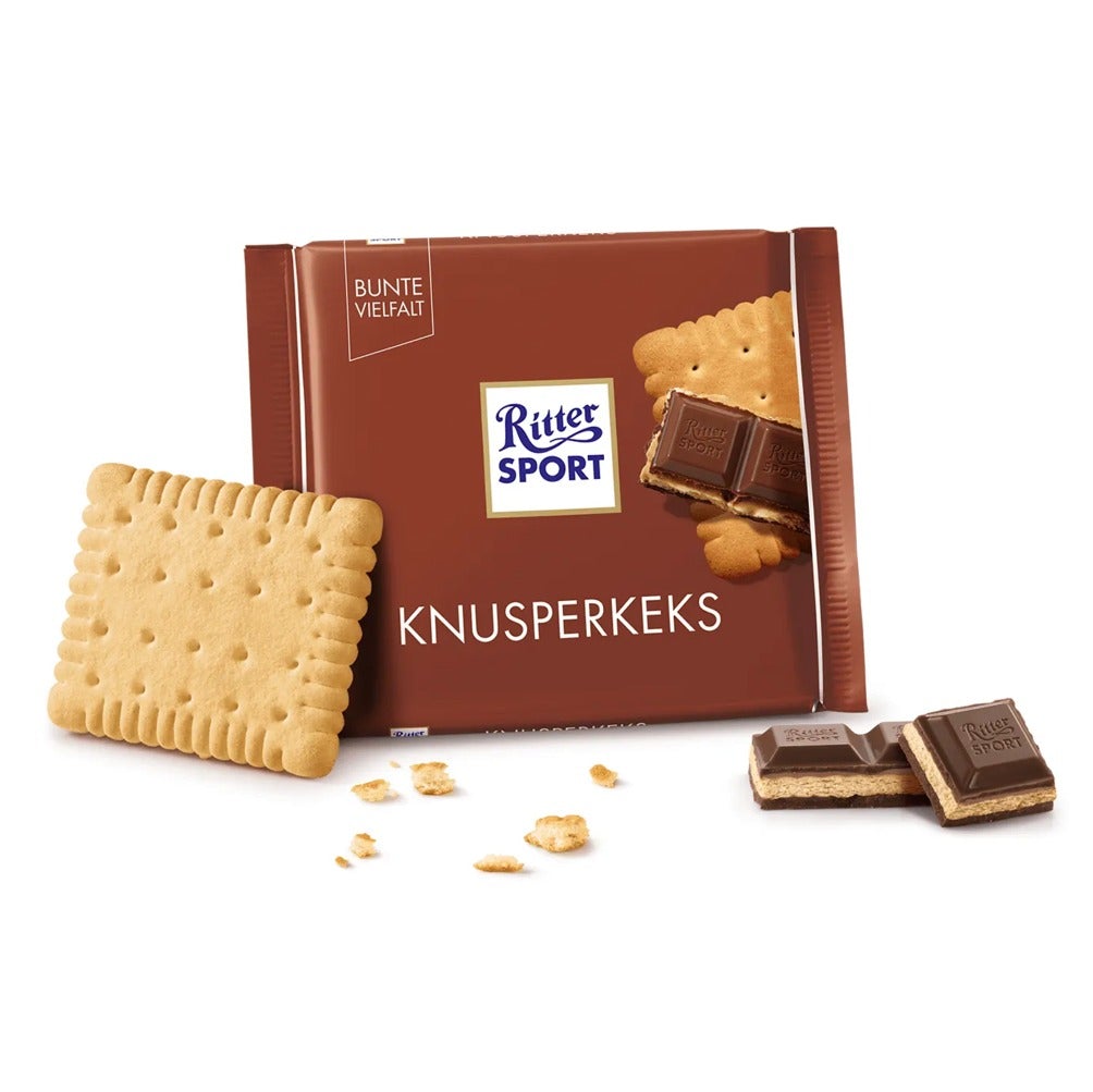Λάτρεις των γλυκών ενωθείτε να ανακηρύξετε τον νέο βασιλιά της σοκολάτας! Η Ritter Sport Knusperkeks θα γίνει η αγαπημένη σου αφού πάνω σε μια στρώση με πλούσια κρέμα γάλακτος-κακάο απλώνεται ένα τραγανό μπισκότο βουτύρου, το οποίο περιβάλλεται από λαχταριστή σοκολάτα γάλακτος. Αυτός ο γευστικός «γρίφος» απόλαυσης σπάει σε χρόνο μηδέν.