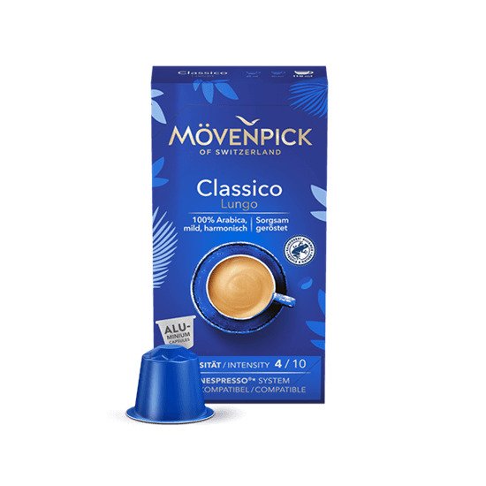 Κάψουλες καφέ Mövenpick Lungo Classico, λεπτή γλυκύτητα καραμέλας, ήπιες καβουρδισμένες νότες και φρουτώδεις νότες εσπεριδοειδών, απαλό σώμα. Ένα ισορροπημένο Classico με απαλά πικάντικες πινελιές για αρμονικό άρωμα, που ξεδιπλώνεται από το ιδιαίτερα απαλά καβουρδισμένο μείγμα κόκκων Arabica Νότιας Αμερικής και Ανατολικής Αφρικής, παρέχοντας 100% γεύση. Ένταση 4/10, πιστοποίηση Rainforest Alliance.