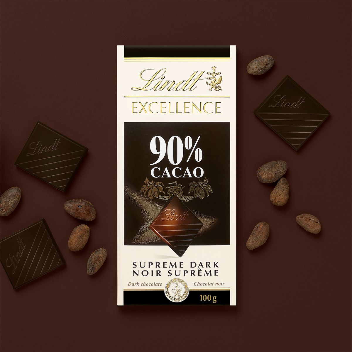 Οι γνώστες της μαύρης σοκολάτας θα εκτιμήσουν τις πολύπλοκες νότες και τα βαθιά αρώματα καβουρδισμένων κόκκων καφέ, φθινοπωρινών φύλλων, ξύλου και δέρματος σε αυτή τη μοναδική Lindt Excellence 90% Cacao Dark Chocolate. Φτιαγμένη με εκλεπτυσμένη μαύρη σοκολάτα από υψηλής ποιότητας κόκκους κακάο από το Εκουαδόρ, τη Μαδαγασκάρη, τη Γκάνα και τα νησιά της Καραϊβικής, η βαθιά της γεύση δημιουργεί μια χορταστική σοκολάτα που κάθε της μπουκιά αποτελεί εμπειρία.