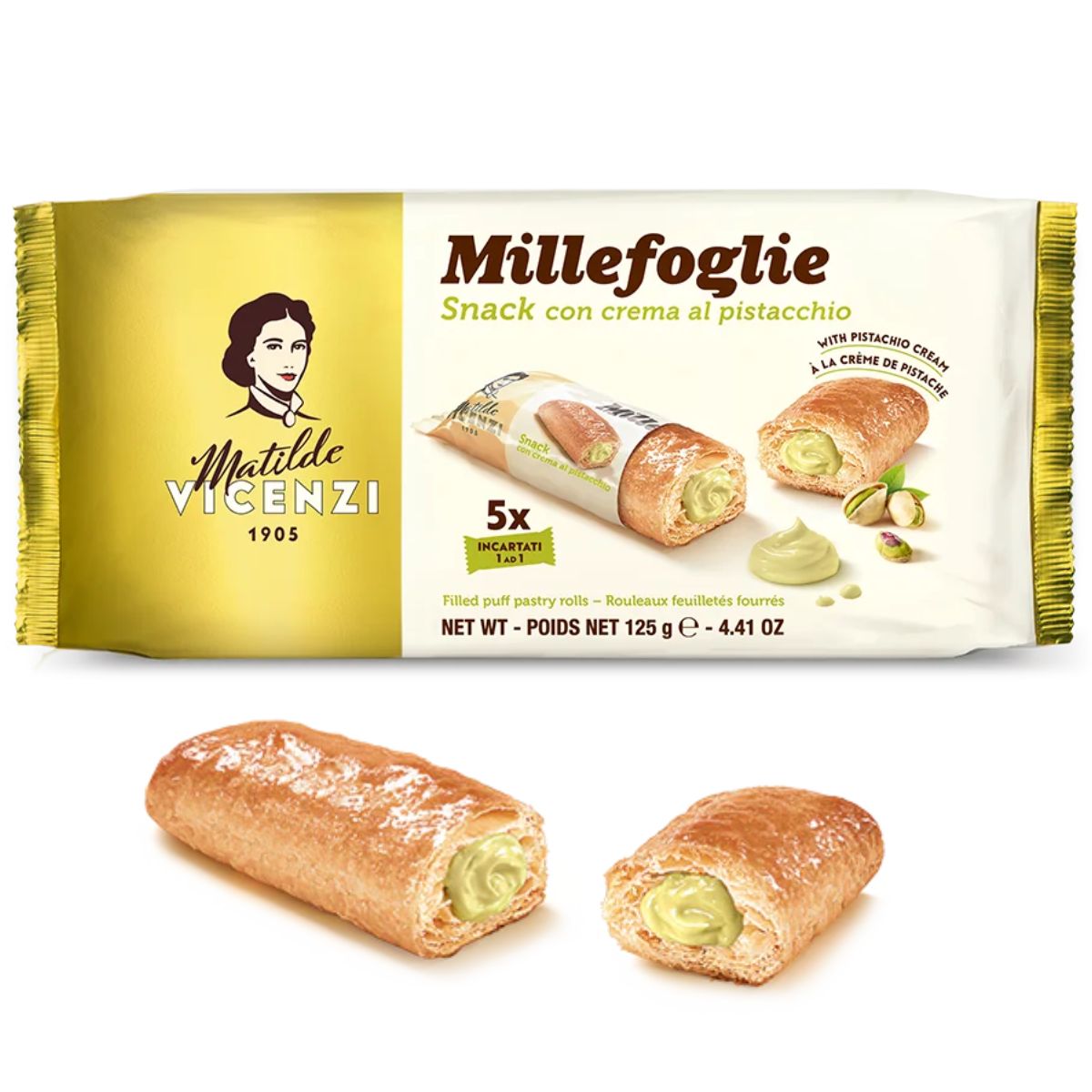 Τα μπισκότα σφολιάτας με κρέμα φυστικιού της Matilde Vicenzi αποτελούν υπόδειγμα τελειότητας της ιταλικής ζαχαροπλαστικής! Κάθε στρώση είναι τραγανή και λεπτή, γεμάτη με κρέμα φιστικιού, που προσφέρει μια πλούσια και βελούδινη γεύση σε κάθε μπουκιά. Αυτά τα μπισκότα είναι ιδανικά για μια γρήγορη γλυκιά απόλαυση στο σπίτι, στο γραφείο ή εν κινήσει. Συνδύασέ τα και με έναν εσπρέσο για μια αυθεντική ιταλική στιγμή!