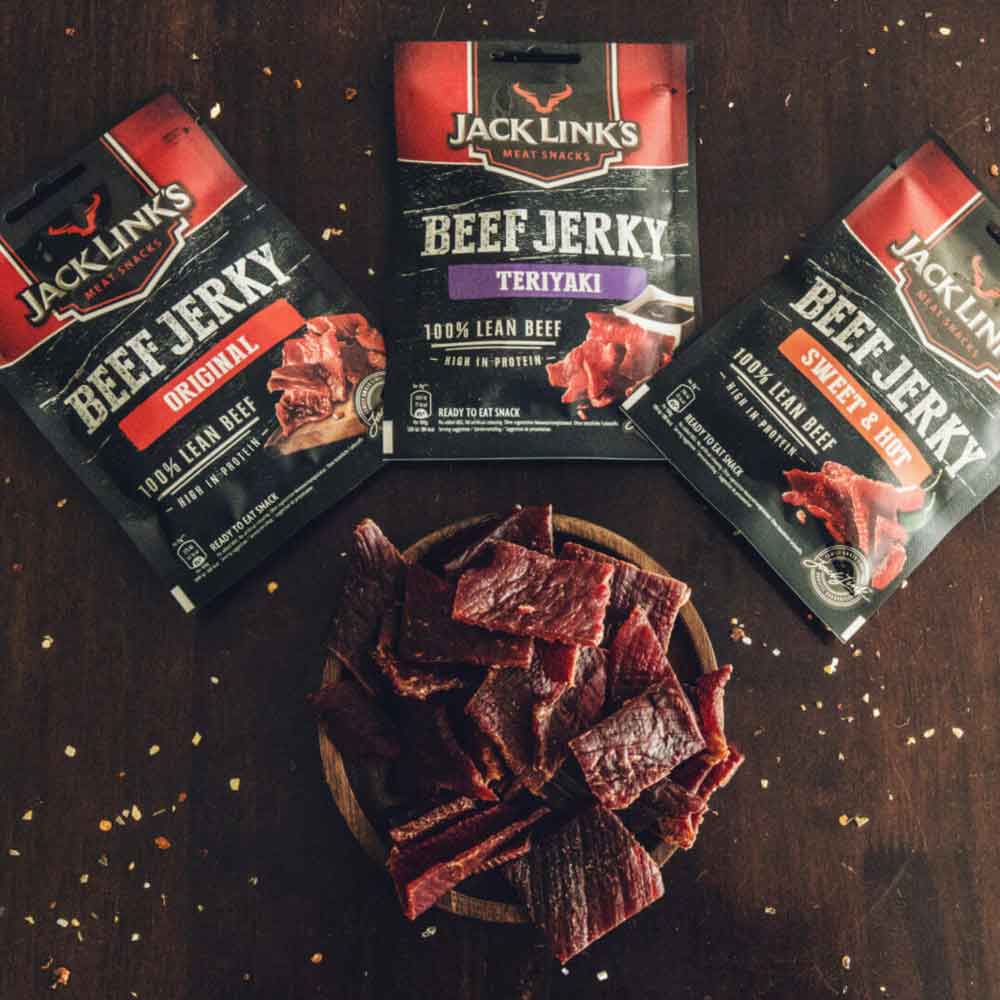 Απλό, καπνιστό και πικάντικο! Το Jack Links Beef Jerky είναι το πιο εκλεκτό βοδινό κρέας, εκλεπτυσμένο με τα πιο εκλεκτά μπαχαρικά και στη συνέχεια στεγνωμένο χαλαρά στον αέρα σύμφωνα με την παλιά οικογενειακή συνταγή. Χρειάζονται έως και 178 γραμμάρια βοείου κρέατος κορυφαίας ποιότητας για να παραχθούν μόνο 100 γραμμάρια κορυφαίας κατηγορίας Jack Link’s Beef Jerky. Πλούσιο σε πρωτεΐνες με μόνο 4% λιπαρά, είναι το τέλειο σνακ για όταν βρίσκεστε εν κινήσει ή όταν κάνετε αθλήματα. Εξαιρετικά υψηλό σε φυσική ενέργεια/πρωτεΐνη, εξαιρετικά χαμηλό σε θερμίδες και χαμηλό σε χοληστερόλη.