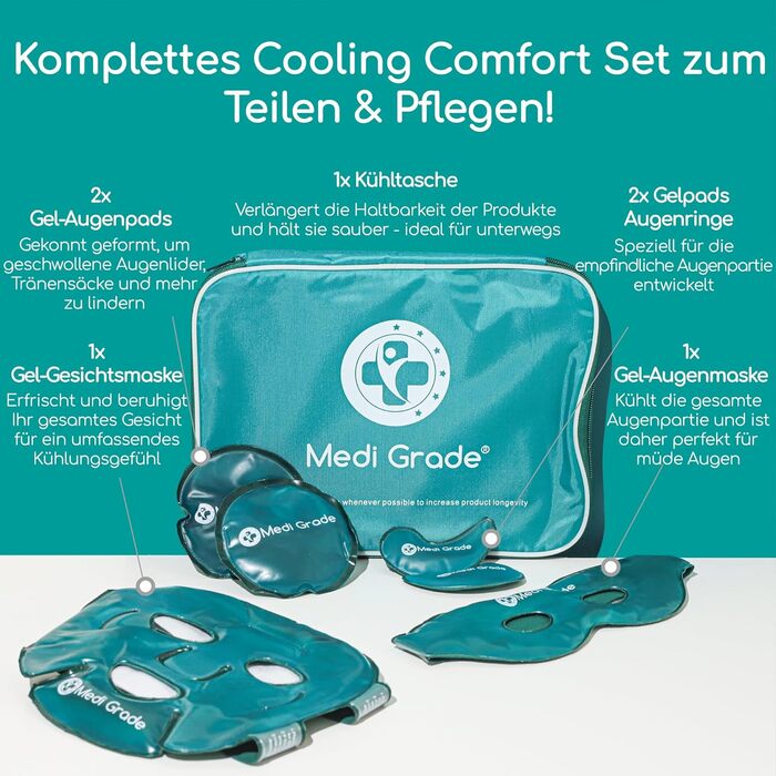 Με το Cooling Face Mask and Eye Pads Set της Medi Grade πες αντίο στo πρησμένo πρόσωπο και στις σακούλες κάτω από τα μάτια. Το σετ περιέχει 1 μάσκα ματιών και 1 μάσκα προσώπου με adjustable bands και 2 στρογγυλά και 2 under-eye επιθέματα ματιών, ώστε να βρήσκεις κάθε φορά το μέγεθος που σου ταιριάζει ανάλογα με τις ανάγκες σου. Μην αργείς λοιπόν, βάλε τα επιθέματα στο ψυγείο ή στην κατάψυξη για 1 ώρα, καθάρισε και στέγνωσε καλά το πρόσωπο σου, τοποθέτησε τα και αφέσου στην κρύα χαλαρωτική αίσθηση για 10 με 15 λεπτά. Ιδανικό για ανακούφιση πονοκεφάλων και ημικρανιών.