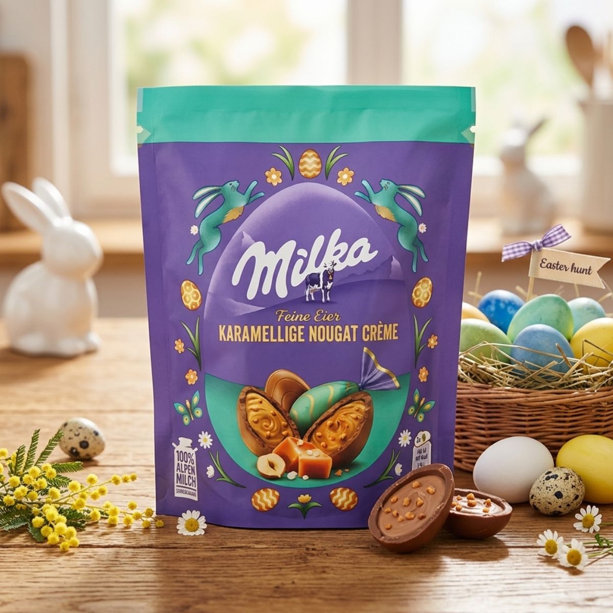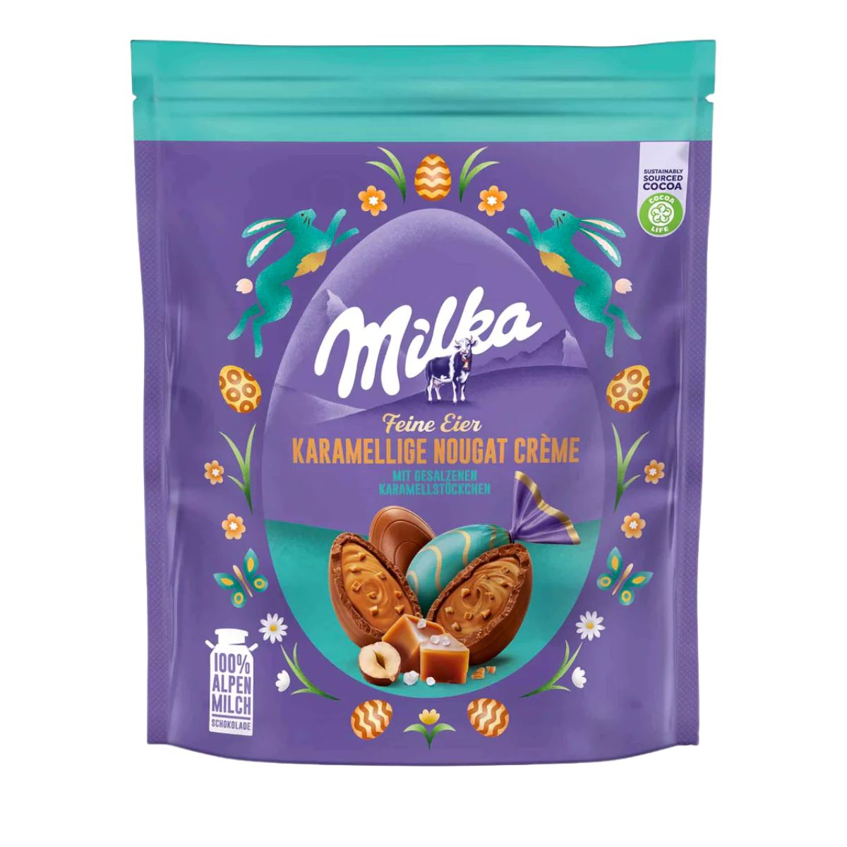 Ήρθαν τα εκλεκτά πασχαλινά αυγά Milka Mini Eggs Nougat Creme and Salted Caramel που κρύβουν μέσα τους καραμελένια νουγκά, αλατισμένα κομματάκια καραμέλας και είναι τυλιγμένα με τη μαγική σοκολάτα που αγαπάμε! Άνοιξε ένα αυγό και αφέσου σε ένα σοκολατένιο ταξίδι γεμάτο γέλιο, χρώματα και γιορτινή διάθεση. Τέλειο για κυνήγι αυγών, δώρα ή απλά για να γλυκάνεις τη μέρα σου!