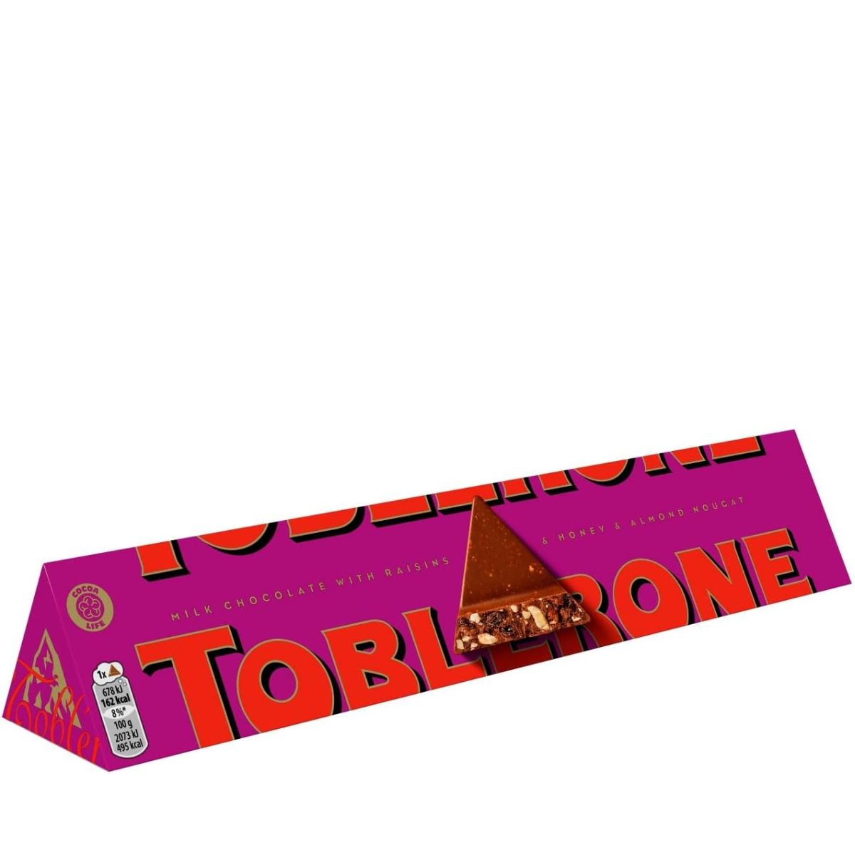 Απολαύστε την εμβληματική τριγωνική απαλή και κρεμώδης, ελβετική σοκολάτα Toblerone με μια ανατροπή. Η αγαπημένη σοκολάτα γάλακτος Toblerone με σταφίδες, μέλι και αμυγδαλωτό νουγκά. Αυτά τα μοναδικά τρίγωνα λαχταριστής σοκολάτας είναι ιδανικά για γενέθλια ή Χριστούγεννα, για να εκπλήξετε την οικογένεια και τους φίλους σας ή για το τέλειο δώρο με μια εκπληκτική ανατροπή. Η Toblerone δημιουργήθηκε το 1908 από τον Theodor Tobler και είναι πλέον διαθέσιμη σε όλο τον κόσμο και αναγνωρίζεται αμέσως χάρη στο μοναδικό σχήμα της και την αδιαμφισβήτητη συσκευασία της. Λέγεται ότι το τριγωνικό σχήμα Toblerones εμπνεύστηκε από την ορεινή πατρίδα του Theodor Tobler, Matterhorn. Η λέξη Toblerone είναι ένα παιχνίδι με το όνομα της οικογένειας των ιδρυτών, Tobler και της ιταλική λέξης για το μέλι και το νουγκά αμύγδαλο, Torrone. Από 100% βιώσιμο κακάο που παράγεται ως μέρος του προγράμματος Cocoa Life που υποστηρίζει τους αγρότες, τις τοπικές κοινότητες και τη γη σε περιοχές που καλλιεργείται κακάο.