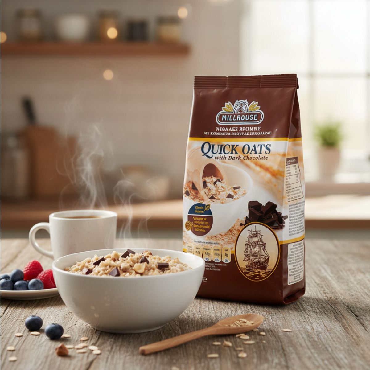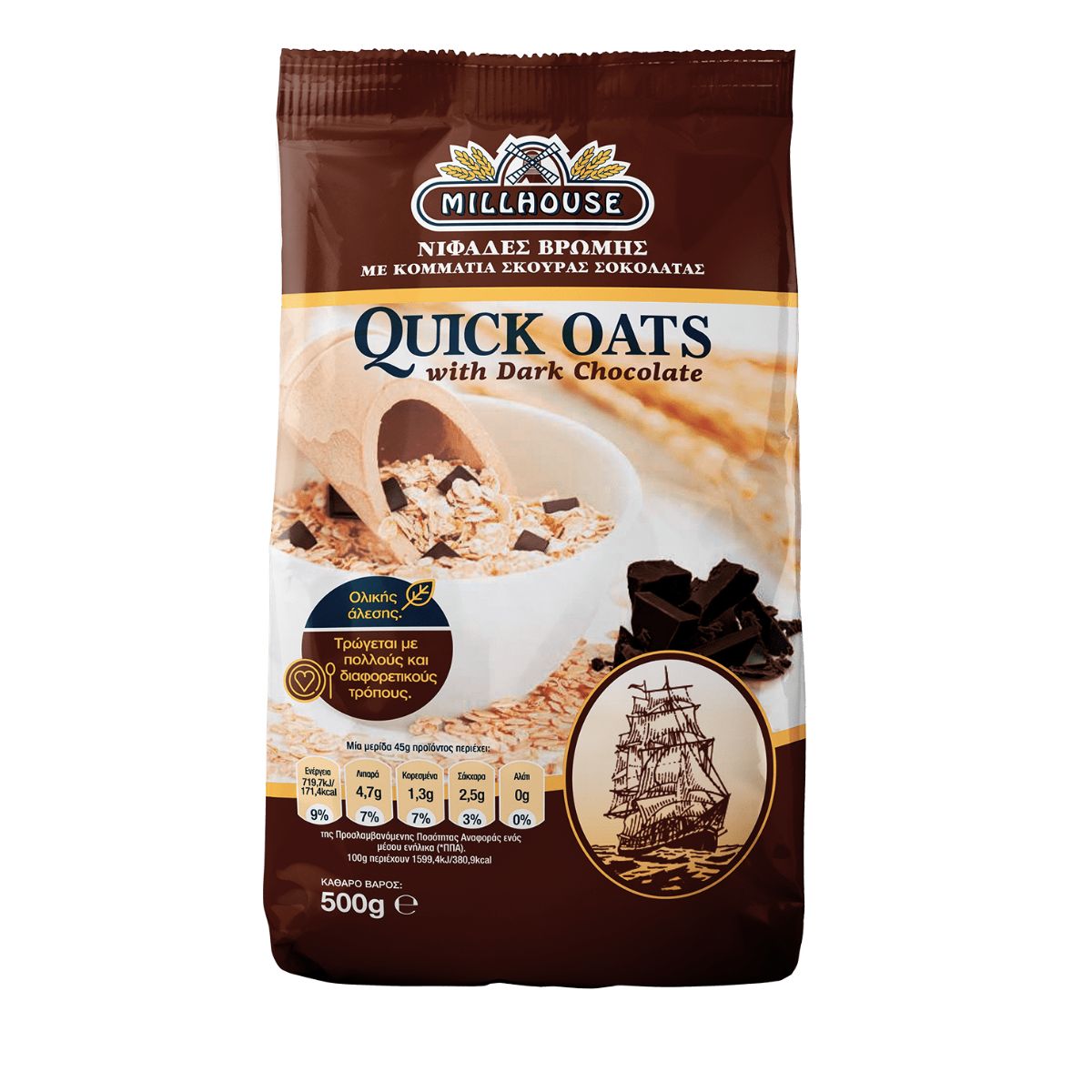 Με τις Quick Oats Dark Chocolate της Millhouse θα κάνεις τις πιο νόστιμες και υγιεινές παρασκευές. Μπορείς να τις απολάυσεις είτε μόνες τους με το αγαπημένο σου γάλα βρώμης, είτε να δημιουργήσεις τα πιο νόστιμα μπισκότα και γλυκά. Υψηλή πηγή φυτικών ινών. Χωρίς φοινικέλαιο. Χαμηλό σε αλάτι και σάκχαρα. Κατάλληλο για χορτοφάγους.